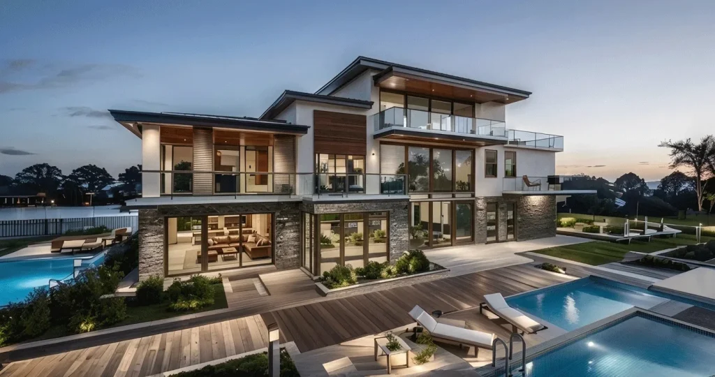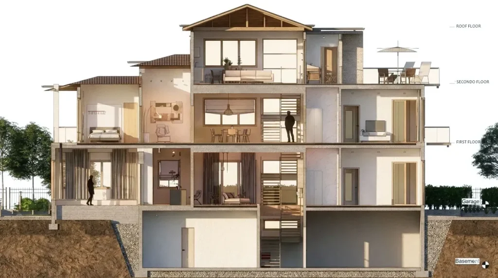 Le style de la villa s’inspire d’une esthétique rurale et organique, en harmonie avec le caractère très naturel de la zone. La maison se développe sur trois niveaux, auxquels s’ajoute un sous‑sol comprenant une salle de cinéma et une petite salle de sport.