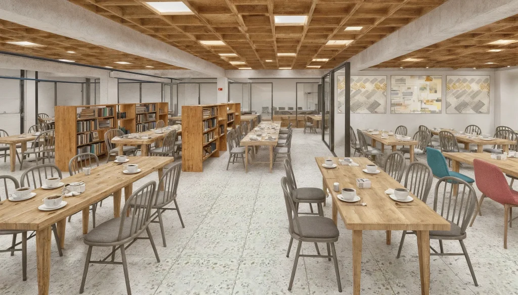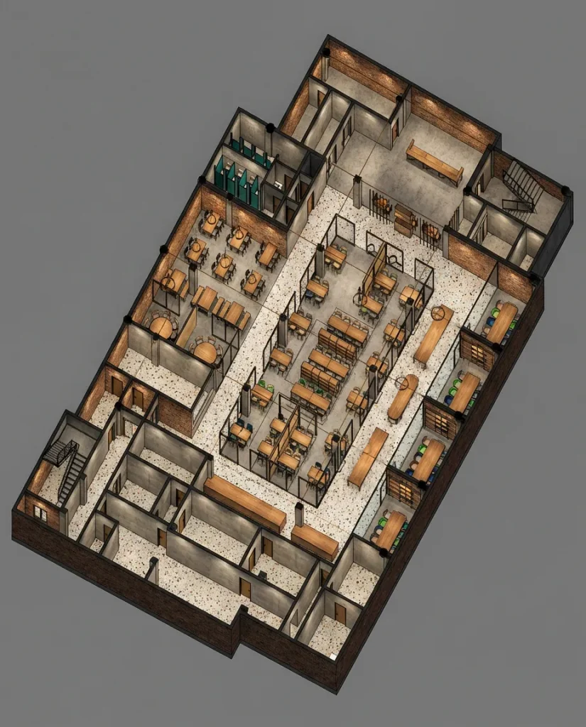 The layout is organized to guide guests fluidly through the different areas, while the upper floor offers additional seating in a more intimate setting. The result is a dynamic venue where food, design, and everyday lifestyle come together in a cohesive and contemporary experience.