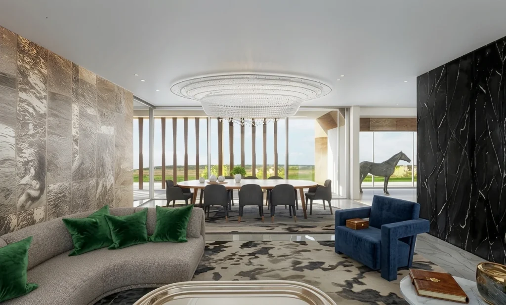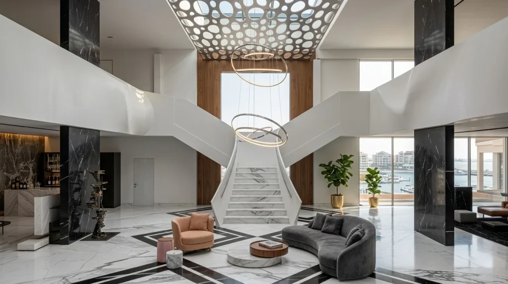 Villa italienne conceptuelle Mon projet capture l’essence de l’architecture italienne à travers des lignes élégantes et fluides qui évoquent la nostalgie et une beauté intemporelle. La grande entrée mène à un escalier panoramique, incarnant la grandeur et la tradition des escaliers monumentaux italiens, un hommage à l’héritage architectural de mes origines. Un élément distinctif du projet est le plan d’eau situé à l’arrière, intégré de manière fluide à la piscine, créant une expérience visuelle unique et harmonieuse.